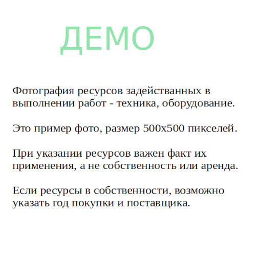 Пиковое количество ресурса, использованное при выполнении работ:1шт. Тип ресурса: "Транспорт грузовой" Наименование ресурса: "DEMO ресурс наименование" Описание ресурса: "Описание DEMO ресурса до 1000 знаков." Год приобретения:2004 Поставщик:"DEMO поставщик наименование"
